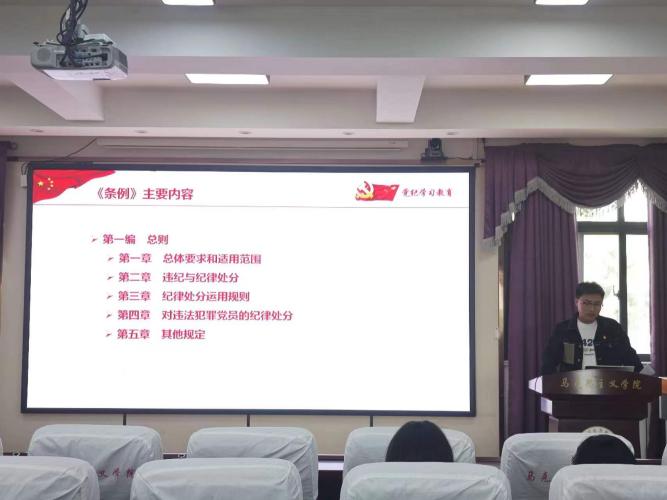 党支部书记魏京章围绕《中国共产党纪律处分条例》上了主题党课,为进一步贯彻落实《通知》精神,本次主题党课以充分学习《中国共产党纪律处分条例》为主要目的,逐章逐条展示了《条例》内容,全面系统地介绍了《条例》总体要求与适用范围、违纪与纪律处分形式、纪律处分运用规则等具体内容,带领党支部全体同学强化了良好的党纪意识。