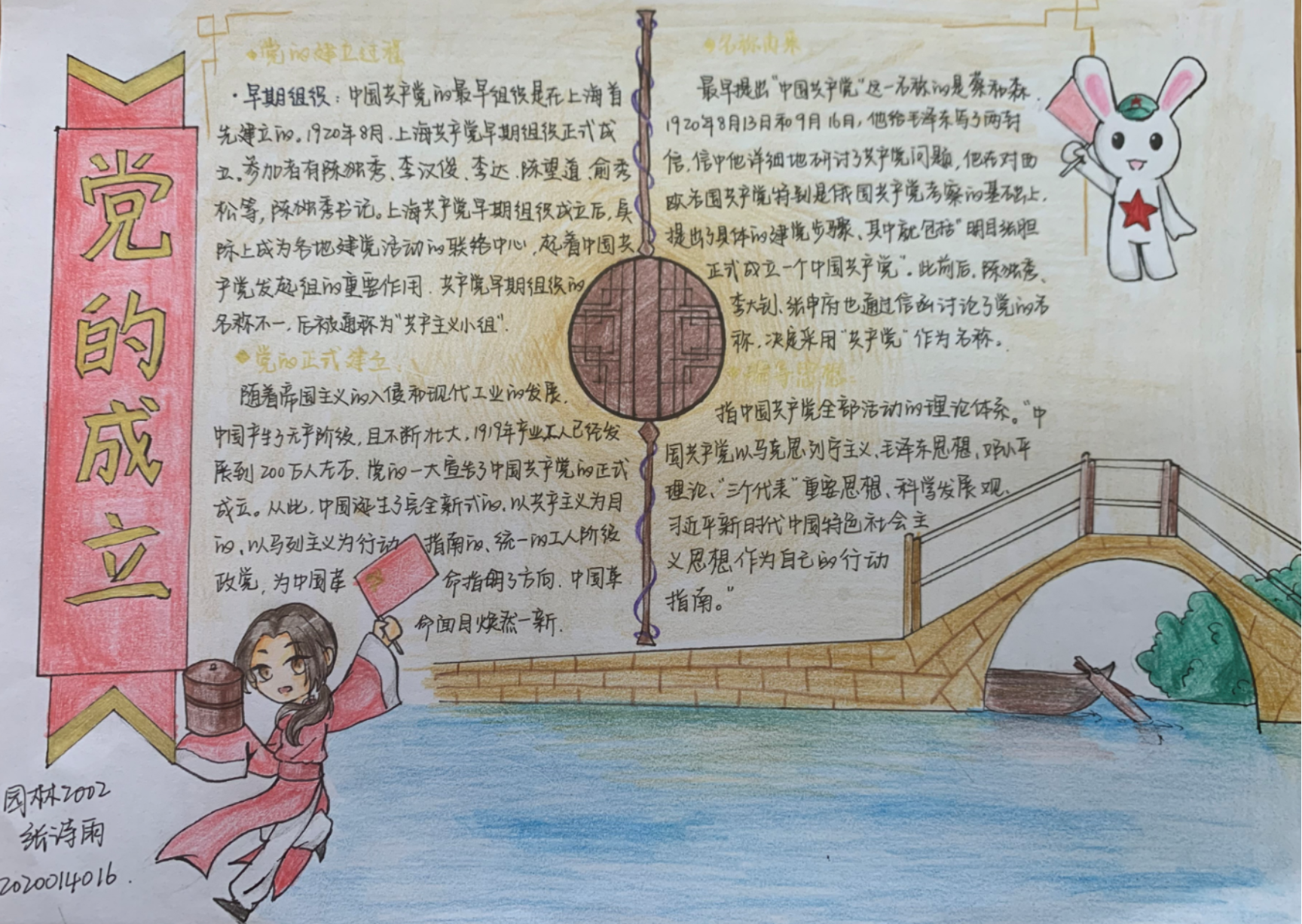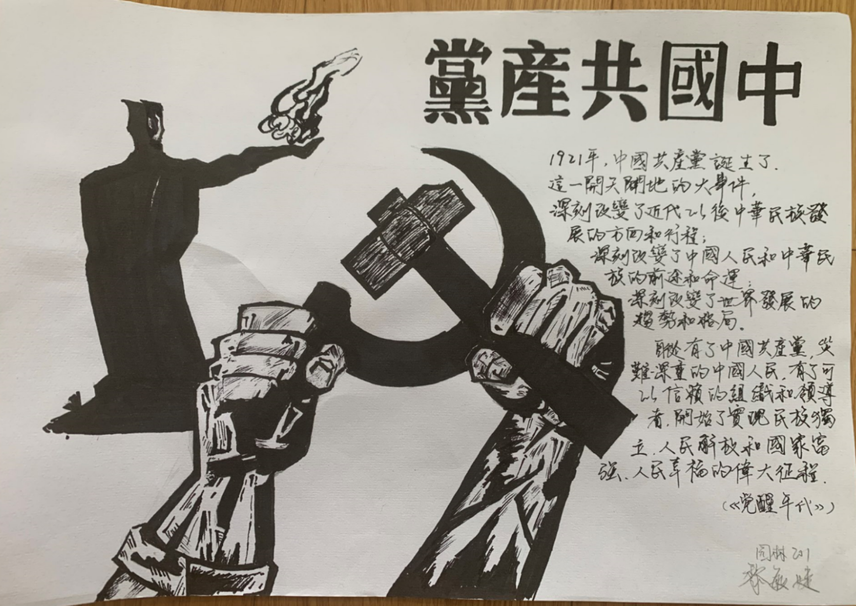习近平总书记在庆祝中国共产党成立95周年大会上的讲话指出,“中国产生了共产党,这是开天辟地的大事变。这一开天辟地的大事变,深刻改变了近代以后中华民族发展的方向和进程,深刻改变了中国人民和中华民族的前途和命运,深刻改变了世界发展的趋势和格局。”五年前的我是以一名专职辅导员的身份学习了总书记的讲话,五年后的今天,习近平总书记在建党100周年的讲话中,又重申了这三句话,我以一名思政课教师的身份带领学生共同学习,感触更多,体会更深。结合对习近平总书记讲话中“三个深刻改变了”的学习,我让学生结合自己的专业特长,根据中国近现代史纲要课程学习,图画百年党史,为建党100周年献礼。