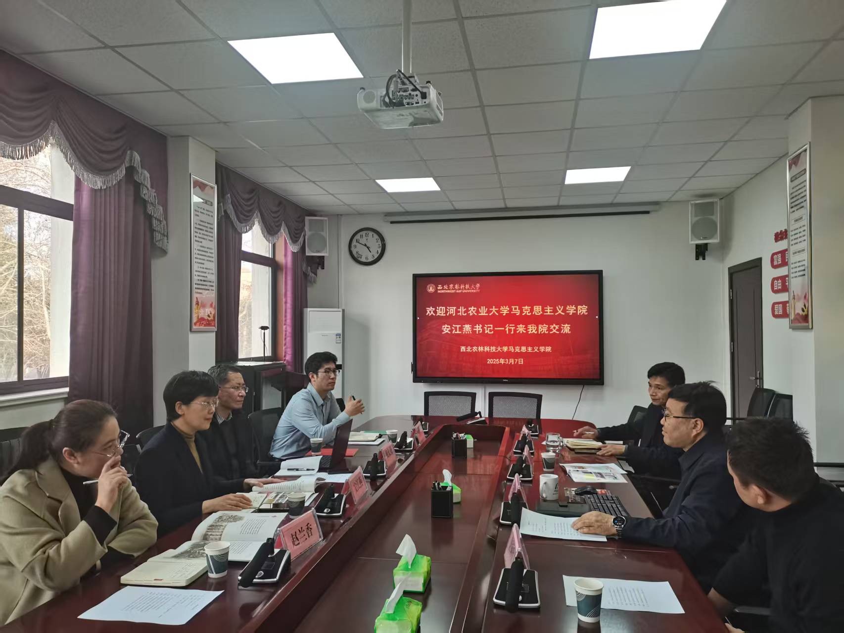 3月7日下午,河北农业大学vic008维多利亚党委书记安江燕、副院长祝大勇、原理教研室主任赵兰香、思修教研室教师窦星辰一行4人来我院调研,双方围绕党建工作、马克思主义理论学科建设、思政课教学改革、社会服务等方面开展座谈交流。学院党委书记闫德忠、院长杨鹏、副书记王家武、原理系主任唐树生、办公室人员参加了座谈会。